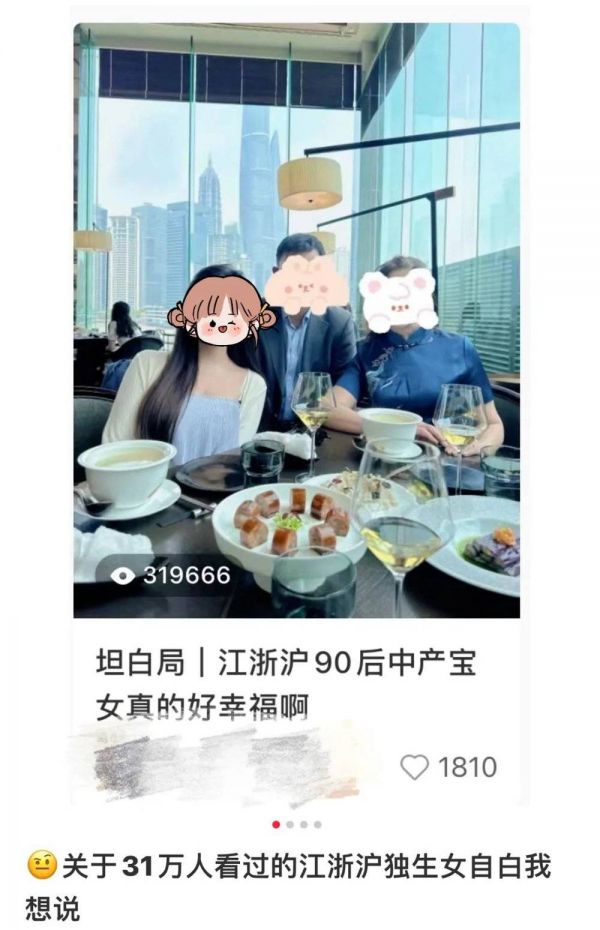 只不过,这个标签究竟是符合现实还是更接近于都市传说,仍有待追问。已经有不少“江浙沪独生女”发言指出,江浙一带的高考竞争十分激烈,父母又看重子女读书好工作好的面子问题,即使“不用她养家”是真的,女儿们也断然是不会轻松的。而庇护和所谓“一生顺遂”的代价则是不能离开本省、乖乖待在父母身边,也不能找外地男友,等于把女儿关在了又一个金丝鸟笼中。