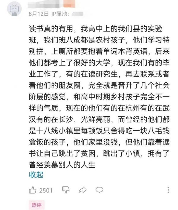 就像有一条评论写到的:他们靠着读书让自己跳出了贫困,跳出了小镇,拥有了曾经羡慕别人的生活。显而易见,当我们把这些个体放置在整个社会背景下去对比时,会发现他们好像从高考开始就已经超越了许多人。