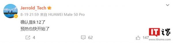 据博主 @Jerrold_Tech 爆料,华为秋季新品发布会将于 9 月中旬举行,主打产品为 Mate 60 系列,随后该博主确认具体日期为 9 月 12 日。目前,尚无法确认该博主的具体身份,其以往的博文多与华为专利、新产品爆料有关,预计为接近华为方面的人士。