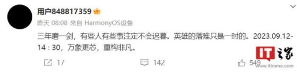 此外,博主 @用户 848817359 曝光了华为发布会的具体举办时间 ——9 月 12 日 14:30,并暗示主题为“万象更芯,重构非凡”。