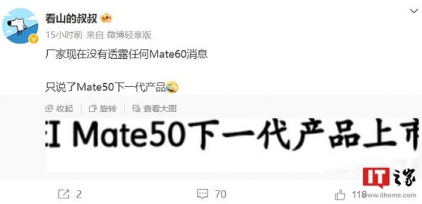 值得一提的是,博主 @看山的叔叔 透露,厂家现在没有透露任何 Mate 60 消息,只说了 Mate 50 下一代产品。这也就是说,华为新旗舰手机是否会以“Mate 60”命名尚不确定。