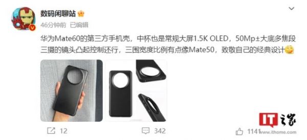 据IT之家此前报道,华为 Mate 60 第三方手机壳已经曝光,博主 @数码闲聊站 爆料称该手机将配备常规 1.5K OLED 大屏,搭载 5000 万像素左右的大底多焦段三摄,镜头凸起控制不错,三围宽度比例有点像 Mate 50,致敬自家经典设计。