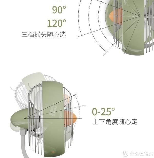 功能上,有45°、90°、120°摇头可选,上下25°的仰角调整。风吹出来是比较柔和的那种自然风,吹一宿也不会觉得头痛;同时噪音也不大,睡觉不觉得吵。