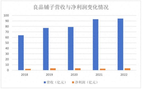 财报层面,2018-2022年,良品铺着实现营收分别为63.78亿、77.15亿、78.94亿、93.24亿、94.40亿,营收增速明显放缓。