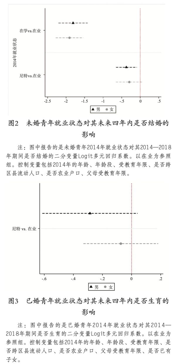 二是本研究主要检验的是就业状态对青年婚育行为的平均影响,没有深入探讨不同阶层背景青年之间的异质性。前文也提到,不就业青年往往依靠家庭的经济支持,家庭资源的差异很可能让青年在就业和婚育选择上面临不同的限制,这些问题希望在未来的研究中得以深入探讨。