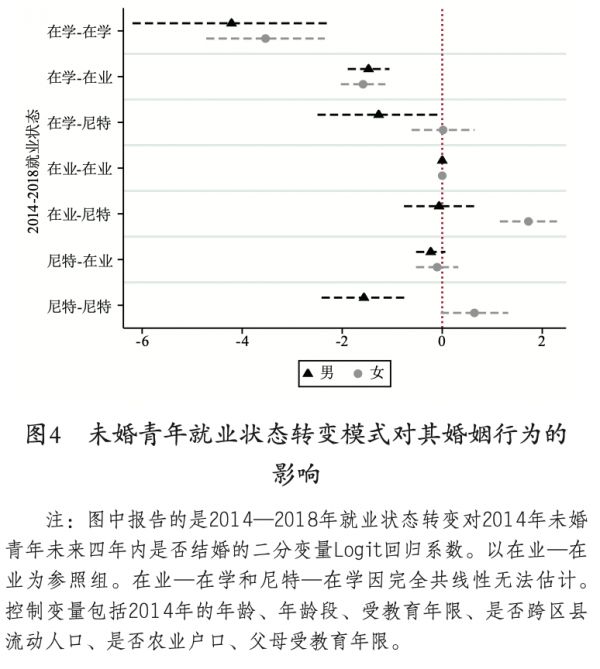 图4的回归结果证实了结婚和就业是青年-成年转变两个彼此关联的转折性事件。对于男性来说,长期稳定的工作状态是进入婚姻的基础,在业-在业的未婚男青年的结婚发生比最高。对于女性青年来说,成为或持续处在尼特状态和进入婚姻之间存在正向关系,但这很可能反映的是逆向因果的作用,即女性更可能因为婚育而成为尼特。如果剔除掉逆向因果的情况(即三种成为尼特的路径),稳定就业的女性的结婚发生比最高。即使不考虑逆向因果,在业-尼特的女性的结婚发生比最高。这表明成功就业的经历也是女性婚姻的重要前提。