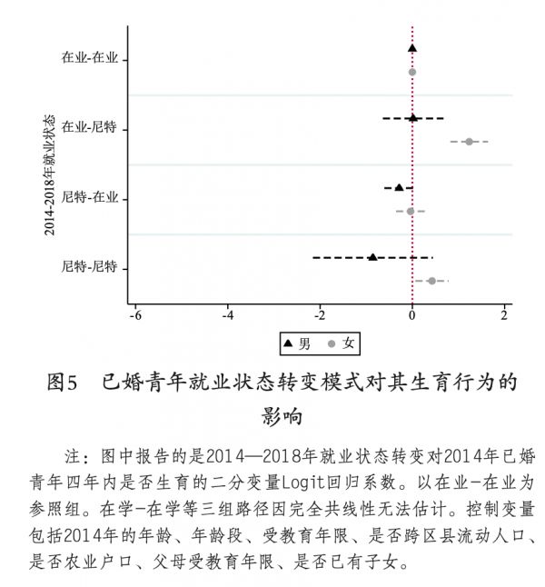 除了成为尼特的三种路径之外,其他路径包括(“在学-在学”“在学-在业”“尼特-在业”)对男女青年婚姻行为的影响无显著差异。在男女教育趋同和职业性别隔离降低的大背景下[58],这一结果表明就业状态对中国男女青年的婚育选择影响也趋同。图5展示了已婚青年就业状态转变模式对其生育行为的影响。