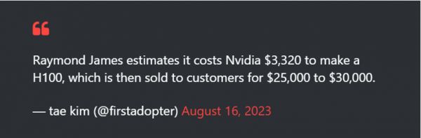 8月16日,《巴伦周刊》资深撰稿人Tae Kim最近在社交媒体上发布的帖子估计,英伟达每销售一块H100 GPU就能获得高达1000%的利润。投资银行公司Raymond James表示:“H100 GPU的起价为3320美元,该公司(英伟达)以25000至30000美元的价格出售这些GPU。尽管我们没有获得AI GPU的BoM表单,但我们当然相信这只是一个粗略的估计,NVIDIA可能会赚得更多。”
