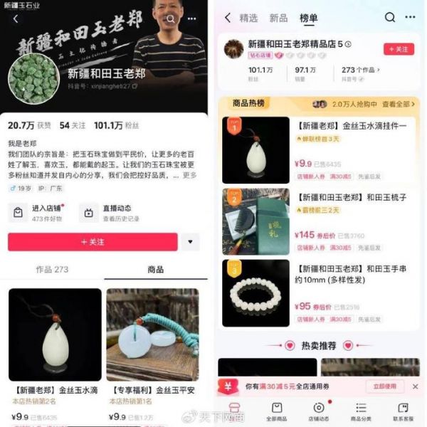 9.9元金丝玉水滴挂件、15元水草玛瑙手串、34.9元和田玉平安扣挂件,进入老郑店铺或直播间可以发现,低价款商品颇受欢迎,他们承担着激发兴趣的引流角色。