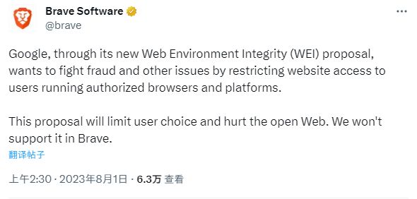 Brave 的 CEO 在社交平台上表示:Brave 浏览器虽然基于 Chromium 开发,但是不会附带 WEI API,就像禁用或取消 Google 放入 Chromium 中的许多其他垃圾一样。Brave 也在官网发布了一篇文章,解释为什么要拒绝 WEI。