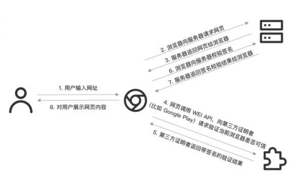 假设,用户在 Android 手机上使用 Chrome 浏览器,访问一个已经使用了 WEI API 的网页。那么当浏览器开始加载网页的时候,网页就可以调用 WEI API,向第三方证明者(也就是 Google Play)验证当前环境是否可信,然后根据验证结果来对用户展示不同的网页内容。