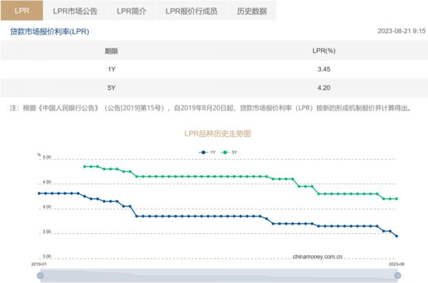 中国人民银行授权全国银行间同业拆借中心公布,2023年8月21日贷款市场报价利率(LPR)为: