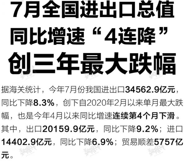 海关总署披露,7月份我国进出口4829.2亿美元,下降13.6%。其中,出口2817.6亿美元,下降14.5%;进口2011.6亿美元,下降12.4%;贸易顺差806亿美元,收窄19.4%。