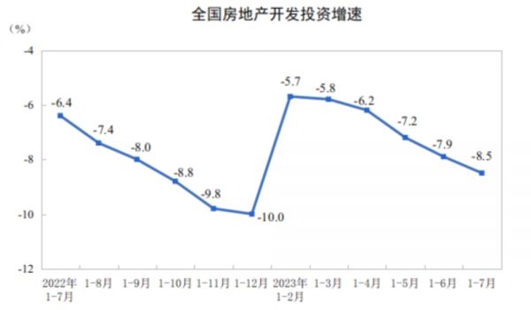 国家统计局披露,1至7月份,全国房地产开发投资67717亿元,同比下降8.5%;其中,住宅投资51485亿元,下降7.6%。