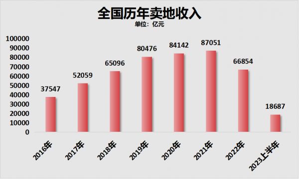 财政部数据显示,2022年卖地收入只有66854亿元,较前一年下降了23.2%。今年上半年,卖地收入只有18687亿元,同比下降了20.9%。