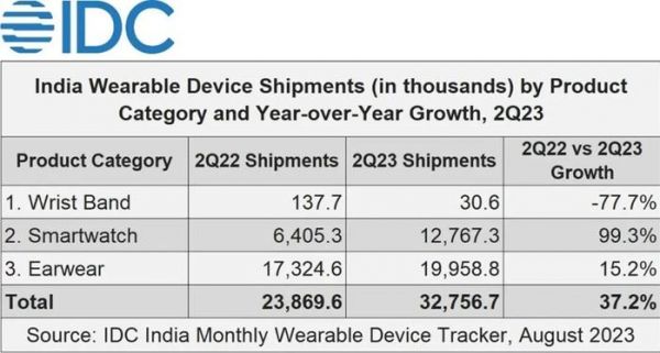 其中,2023年第二季度,印度市场可穿戴设备出货量为3280万台,同比增长37.2%,环比增长30.6%;智能手表出货量几乎翻了一番,达到1280万台;耳戴产品出货量同比增长15.2%。