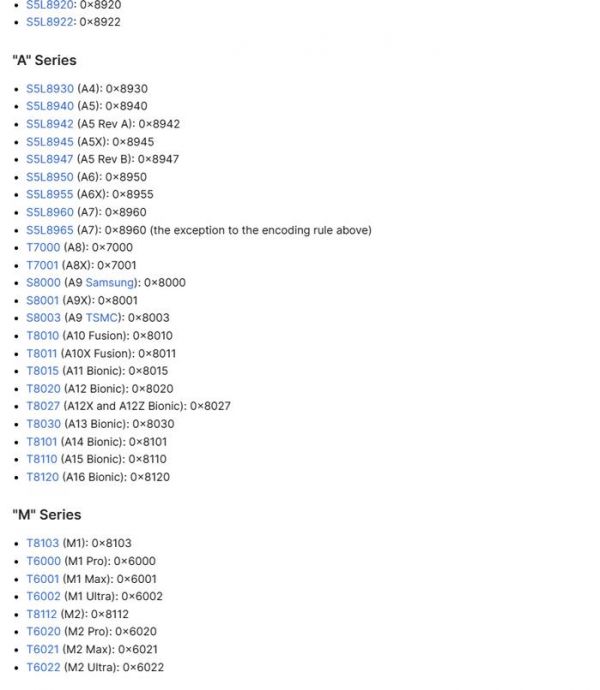 @_orangera1n 补充说,不同的 CPU ID 可以与不同的芯片一一对应。据其提供的参考网站显示,目前苹果 iPhone 14 Pro / Max 系列机型搭载的 A16 仿生处理器代号为 0×8120,iPhone 14 / Plus、iPhone 13 系列机型搭载的 A15 仿生处理器代号则是 0×8110。据此可以推算,苹果 A19 仿生处理器的代号为 0×8150。