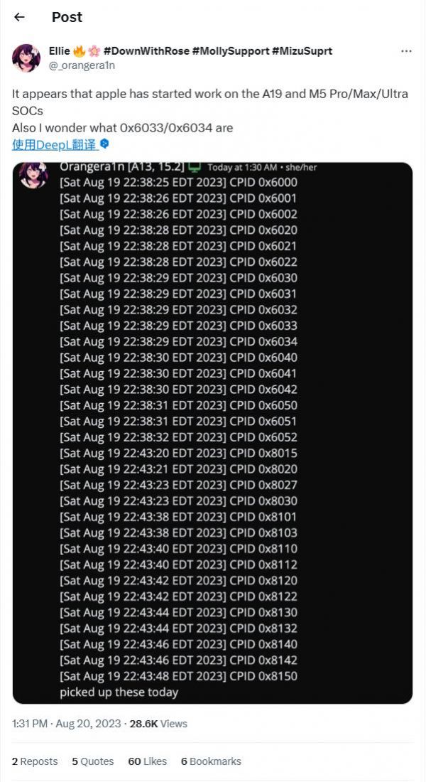 IT之家 8 月 21 日消息,推特博主 @_orangera1n 昨日下午通过 X 平台发文表示,苹果正在研发 A19 仿生芯片和 M5 系列芯片,并放出了几个他抓取到的 CPU ID。