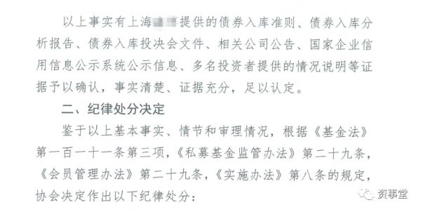 协会文书还透露出,他们确认的事实有该私募机构提供的债券入库准则、债券入库分析报告、债券入库投决会文件、相关公司公告、国家企业信用信息公示系统公示信息、多名投资者提供的情况说明等证据予以确认,事实清楚、证据充分,足以认定。
