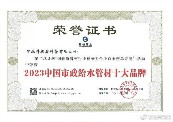 经过近30年的发展与努力,钟格在塑料管道领域取得了显著的成绩。特别是在近期举办的“2023中国管道管材行业竞争力企业百强”评选中,钟格凭借雄厚的企业实力、精湛的技术和强大的产能一举斩获“2023政府采购塑料管道十大品牌”和“2023中国市政给水管材十大品牌”两项重要奖项。这充分体现了钟格产品质量、市场认可度和行业口碑是行业中的佼佼者。