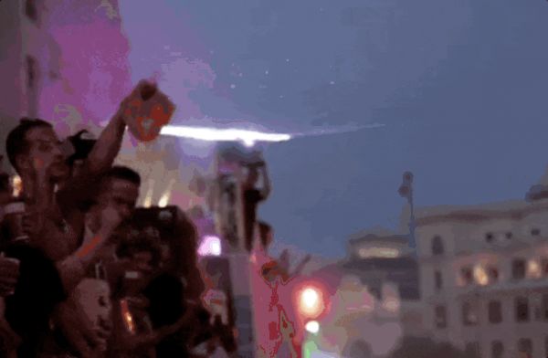 2010年,国外的一位摄影师正在街头拍摄一场庆祝活动,手中的佳能相机刚好被路边的激光灯不断扫射。就在激光扫过第二次的时候,相机所记录的画面上突然出现一条白色的横条纹。