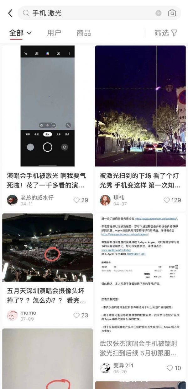 手机上的摄像头也逃不过这一劫。去社交软件上搜索“手机”“激光”,就能看到众多的维修“惨案”。这种损坏只能通过更换手机内部的传感器元件进行维修,费用大多超过1000元。