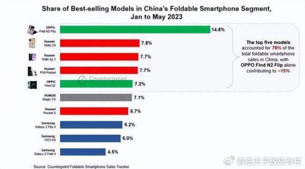 正是因为各方面的优势,让OPPO Find N2 Flip从发布以来销量节节攀升,根据Counterpoint提供的2023年1-5月中国畅销折叠屏手机份额排名数据来看,OPPO Find N2 Flip以14.8%的市场份额占比成为了国内最受欢迎的折叠屏手机,并且从份额占比来看,Find N2 Flip的份额占比要超出第二名接近50%,这一点充分的说明了,亲民+实用+时尚的确是赢得市场的利器。