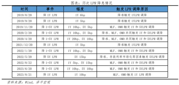 方式上,政策利率调降触发LPR下调。LPR报价由MLF和银行加点构成,政策降息或银行压缩加点都会驱动LPR下行。LPR改革以来共11次调降,其中7次为政策利率的下调触发。本次为央行让利,MLF利率下调15bp至2.5%后,1年期LPR跟随政策利率MLF下调。