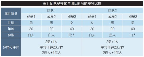 而在现实中,团队1、2的境遇很可能不同。团队1中年龄、性别和种族的划分高度一致,前两位20岁男性白人成员背景相似,且各项特征“断裂”方向相同,与另外一位40岁的女性黑人成员之间差异极大,极易形成“2对1”格局。与之相比,团队2虽然在年龄、性别、种族之间的情形与团队1无异,但是由于各个人口统计学特征在“断裂”的方向上并不相同,因而导致其在合作过程中并不容易产生像团队1那样的“2对1”竞争格局。
