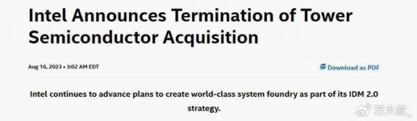 2022年2月15日,英特尔宣布和高塔半导体达成最终收购协议,将以每股53美元收购高塔半导体,双方预计将在约12个月内完成交易,即在2023年2月15日前完成。但由于我国没能在这个时间内批准该交易,因此,英特尔与高塔半导体宣布延长期限至6月15日,之后又再次延长到8月16日。但可惜的是,最终这笔交易仍未能获得中国的批准。