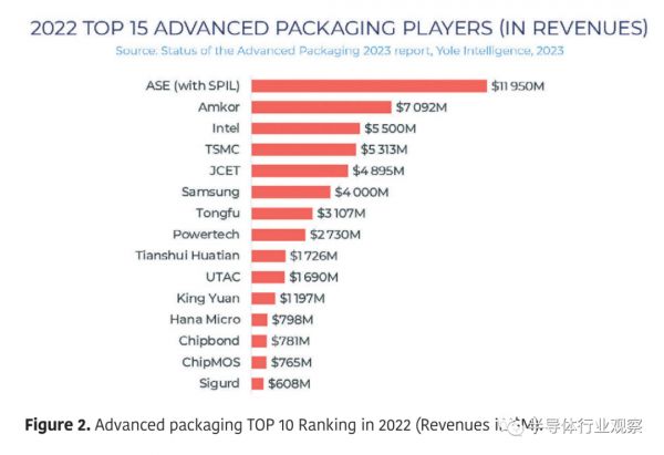 2022 年,著名的超大规模OSAT 日月光以 119 亿美元的令人印象深刻的收入(不包括 USI,包括 SPIL)成为排名中的领跑者。ASE 也有相当大的资本支出,年内投资约 17 亿美元。这几乎是第二大 OSAT 公司 Amkor 的两倍,后者投资了 9.08 亿美元。缩小这些玩家之间的差距无疑将是一项具有挑战性的工作。台积电重新夺回排名第四的位置,仅次于排名第三的英特尔,他们2022 年在封装方面收入分别约为 53 亿美元和 55 亿美元。台积电的成功可归功于其专为CoWoS、InFO 和 SoIC 领域的强化产品开发的,专为高性能计算 (HPC) 和 5G 开发准备的产品。