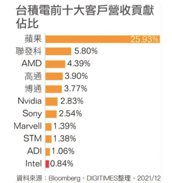 也就是说,在华为被美国制裁之前,台积电有苹果和华为这两个超级客户,但在制裁后,台积电就彻底失去华为了,如今只剩下苹果这个超级客户。