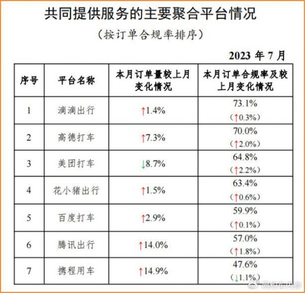 另外,7个聚合平台共完成2.32亿单,环比上升6.4%,占到总订单量的28.26%。其中6个上涨,只有美团打车下降了8.7%。