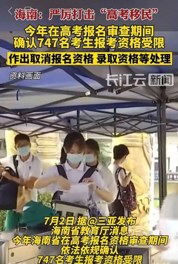 海南省教育厅对外公布称,在2023年的高考名单中,当地在高考报名资格审查期间依法依规确认747名考生报考资格受限,并依法依规作出取消报名资格、录取资格直至取消高等教育学籍、学历的处理,涉嫌违法的移交司法部门严肃处理/图源:长江云新闻视频截图