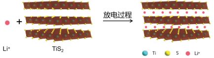 其中TiS₂为层状化合物,层与层之间为相互作用较弱的范德华力(Van der Waals Force),体积较小的锂离子能够进入TiS₂的层间并发生电荷转移,并贮存锂离子,类似于将果酱挤入三明治中,这个过程为离子的插层[4][5]。在放电过程中,正极的TiS₂层间插入电解液中的Li+离子,接受电荷并形成LixTiS₂。