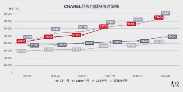香奈儿传出九月将涨价23%的消息,中号CF(Classic Flap)将从74900元直升81900元。这款王牌产品从2019年11月的42600元一路涨价至今,到即将突破8万元大关,昭示着香奈儿定价策略进一步逼近爱马仕。