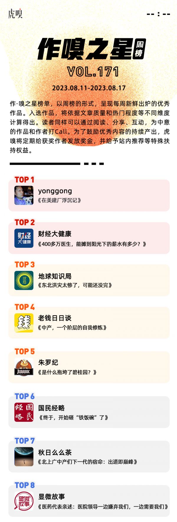 作·嗅之星榜单,以周榜的形式,呈现每周新鲜出炉的优秀作品。2023年8月11日~2023年8月17日,虎嗅第170期作·嗅之星的获奖文章分别是: