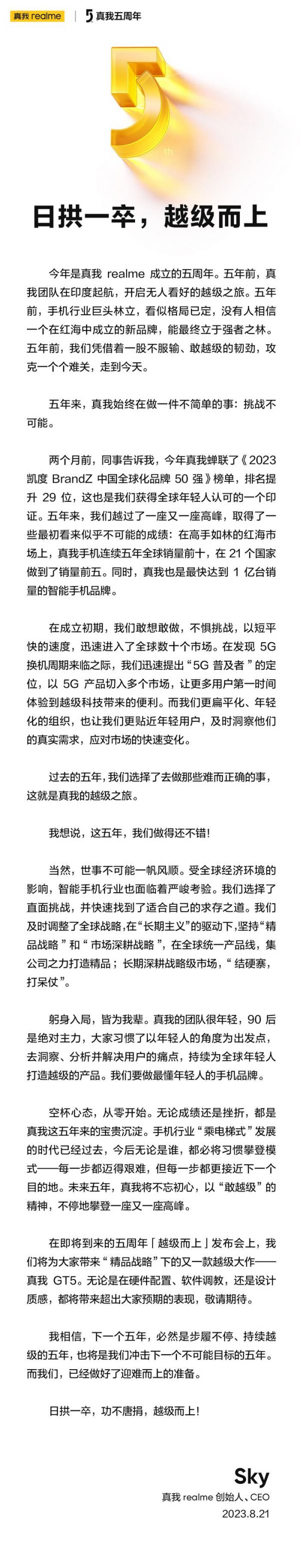 #真我手机21个国家销量前五# realme创始人李炳忠今天发了五周年公开信,并且官宣了8.28发布真我GT5。看了之后我还挺感慨的。为啥这么说呢,还记得2019年5月15日我就参加了真我回归国内首秀realme X发布会,直到今天,见证了真我的一路成长,成为行业领导者,不断崛起。