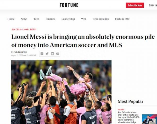 8月22日,权威的《财富》杂志以“梅西带给美国足球巨额经济回报”为题,从经济层面上解读梅西掀起的热潮。迈阿密国际的品牌价值飙升、梅西的比赛一票难求、苹果TV订阅用户猛涨、社交平台爆炸式热议……“梅西效应”不可思议,却又在情理之中。