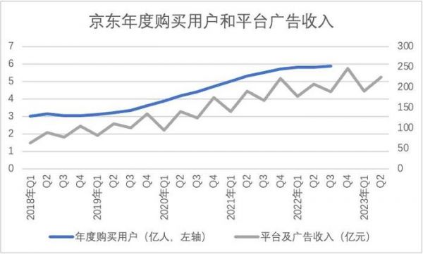 2023 年 Q2 京东平台及广告收入同比增长 10%,联系到上年同期的低基数这个数字确实不能算高,结合上图,我们大概可以猜测 2923 年京东用户增长的成绩应该也不如以往。