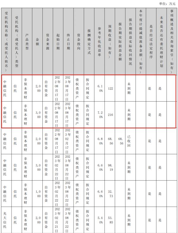 从过往公告记录来看,两家上市公司热衷于购买中融信托产品进行理财投资。