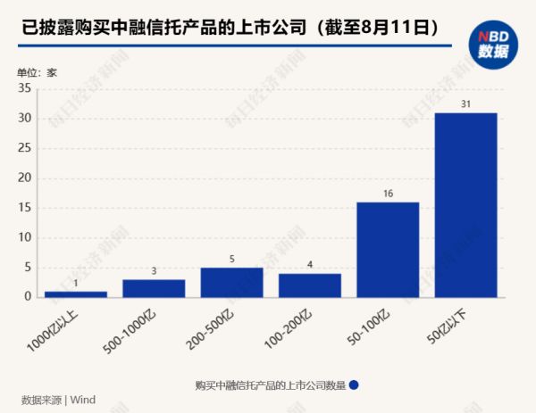 据Wind统计,已披露购买中融信托产品的上市公司中,截至2023年8月11日,市值1000亿以上公司共1家,市值500~1000亿公司共有3家,市值200~500亿公司共有5家,市值100~200亿公司共有4家,市值50~100亿公司共有16家,50亿以下公司共有31家。