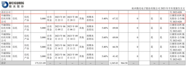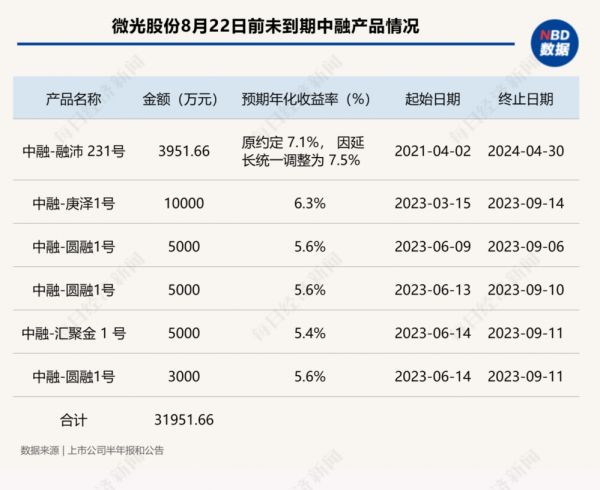 根据半年报披露的委托理财明细,微光股份有9项信托产品在8月22日前未到期,合计委托理财金额约4.7亿元,其中6项为中融信托理财产品,购买金额为3.2亿元。