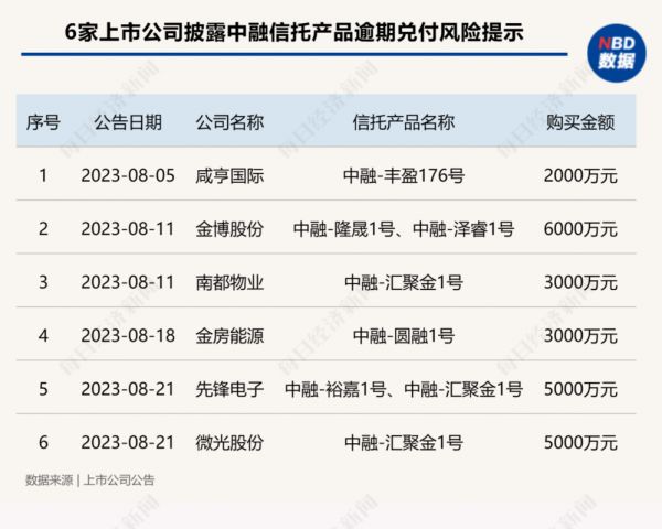 截至目前,已经有6家上市公司公告称其购买的中融信托产品出现兑付风险,包括南都物业、咸亨国际、金房能源等。