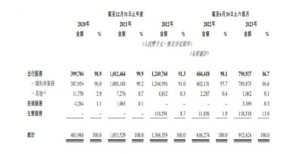 同期,出行服务的交易额从2020年的4.89 亿元以 91.6% 的复合年增长率增至2022年的17.96亿元,今年上半年则从2022年同期的8.27亿元增加51.2%至12.50亿元。