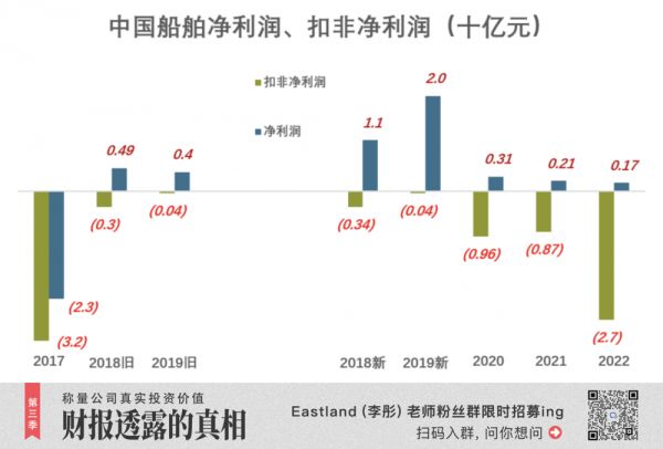 重组前,中国船舶已经摘掉了“ST”帽子。但扣除变卖资产等非经常性收益后仍然亏损。2018年、2019扣非净利润分别为负3.4亿、负4228万元。