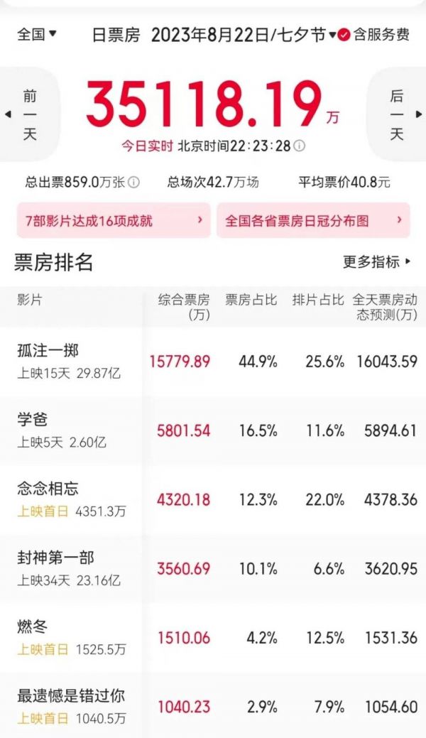 但值得注意的是,撑起今年七夕档大盘的,是已经上映了一段时间的“老片”:以缅北诈骗为题材的《孤注一掷》以超过1.5亿的票房成绩,稳坐排行榜第一;亲子教育题材的《学爸》则居于第二位。而新上的几部爱情片的市场表现却不太理想。