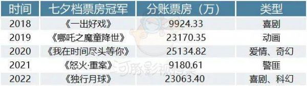在2018年到2022年间的七夕档票房冠军中,只有《我在时间尽头等你》这一部是爱情片。
