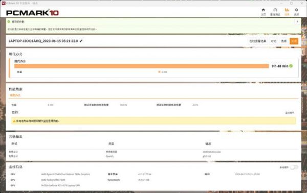 有着强大性能的锐龙9 7940HS处理器,还带来了轻薄的机身设计,但是在续航方面却没有妥协,雷蛇Blade 14 2023内置了一个68.1Wh的电池,我们在使用PCMark 10的现代办公场景进行测试时,获得9小时48分钟的超长续航时间,这是非常令人感到惊讶的,可见锐龙7040HS系列移动处理器的能耗比优化已经遥遥领先于酷睿系列的处理器产品。