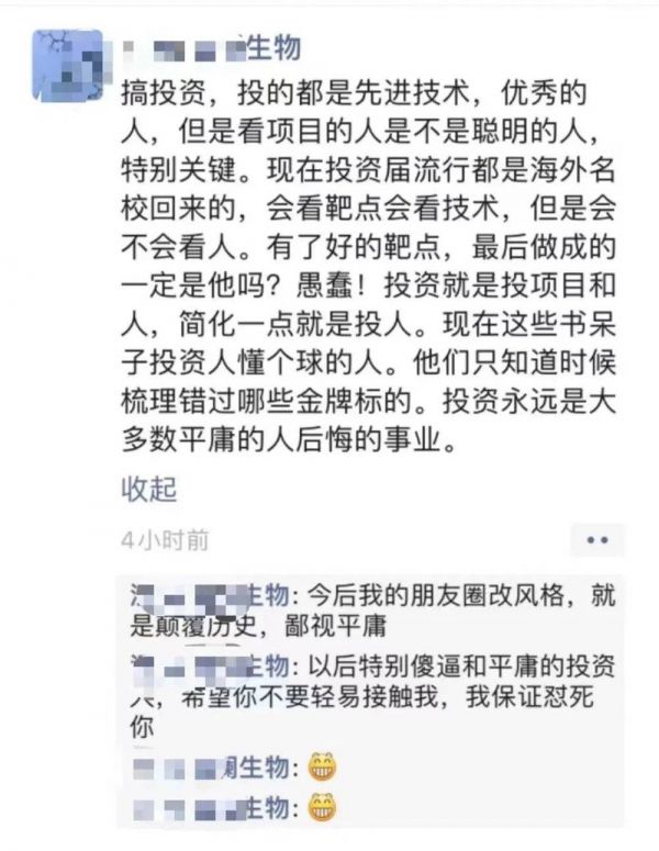 近日,一家新材料创始人在朋友圈发表言论称,“现在投资界流行从海外名校回来的。平庸的投资人,希望你不要轻易接触我,我保证怼死你。”